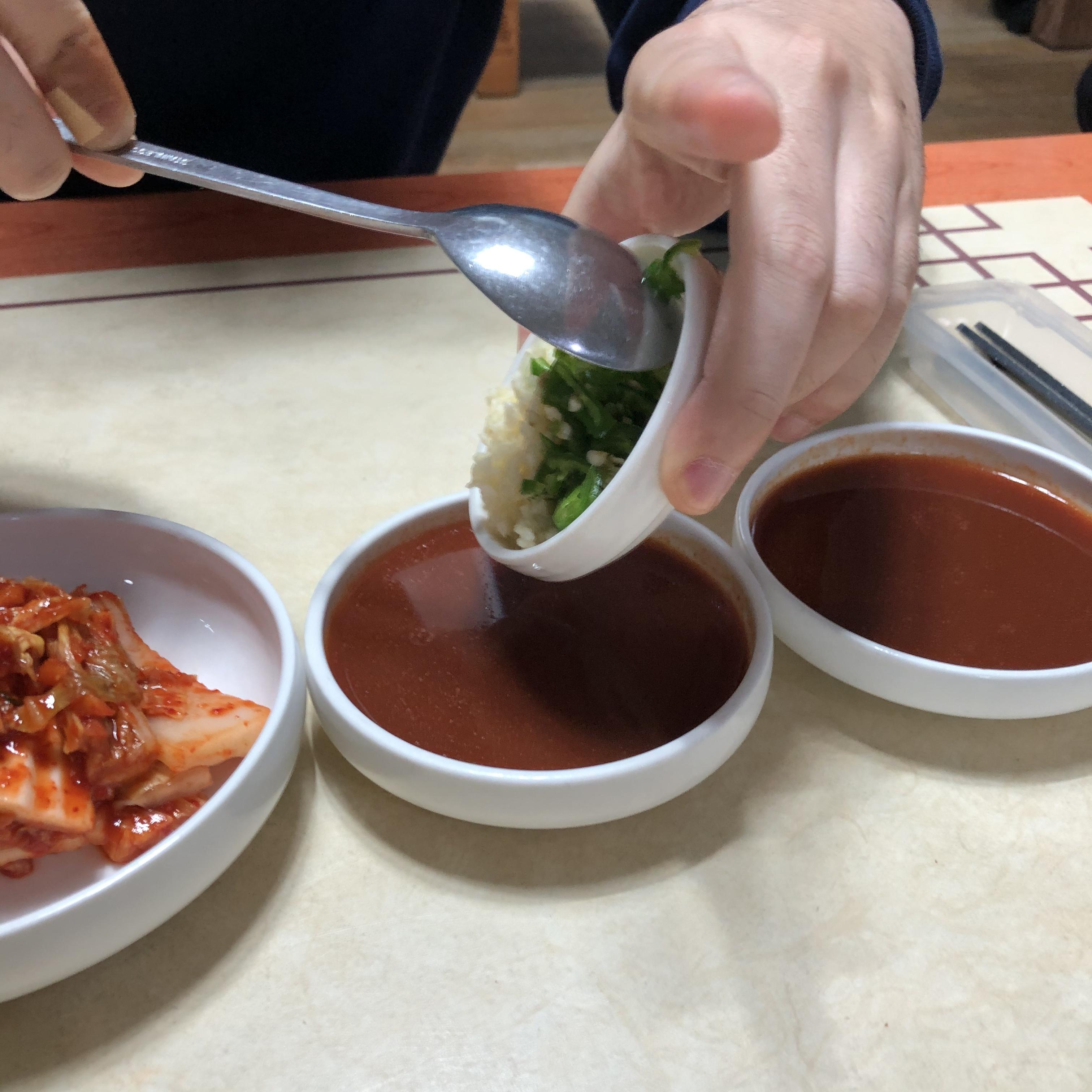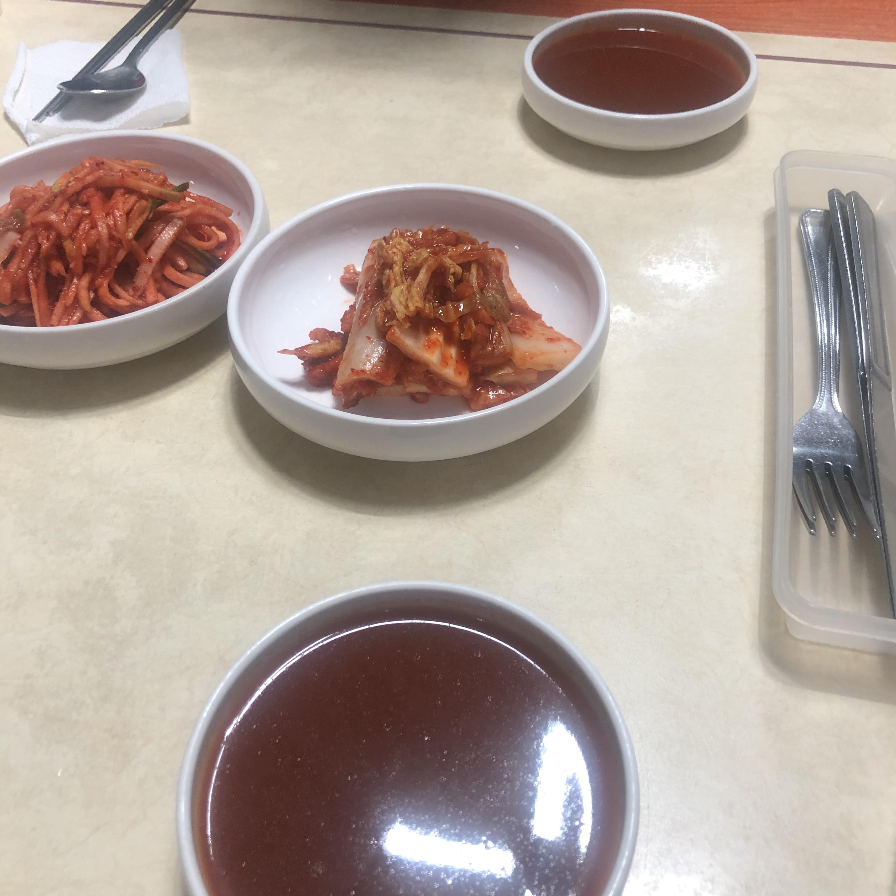 기본 반찬으로 김치와 무생채무침이 나왔다. 반찬들도 깔끔하게 맛있었다. 그리고 소스도 함께 나왔다.