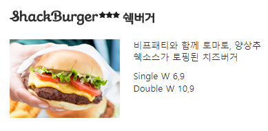 쉑버거는 가장 기본으로 볼 수 있고요. 스모크쉑은 베이컨과 애플 칩이 있다고 하니 더욱 기대되었습니다.