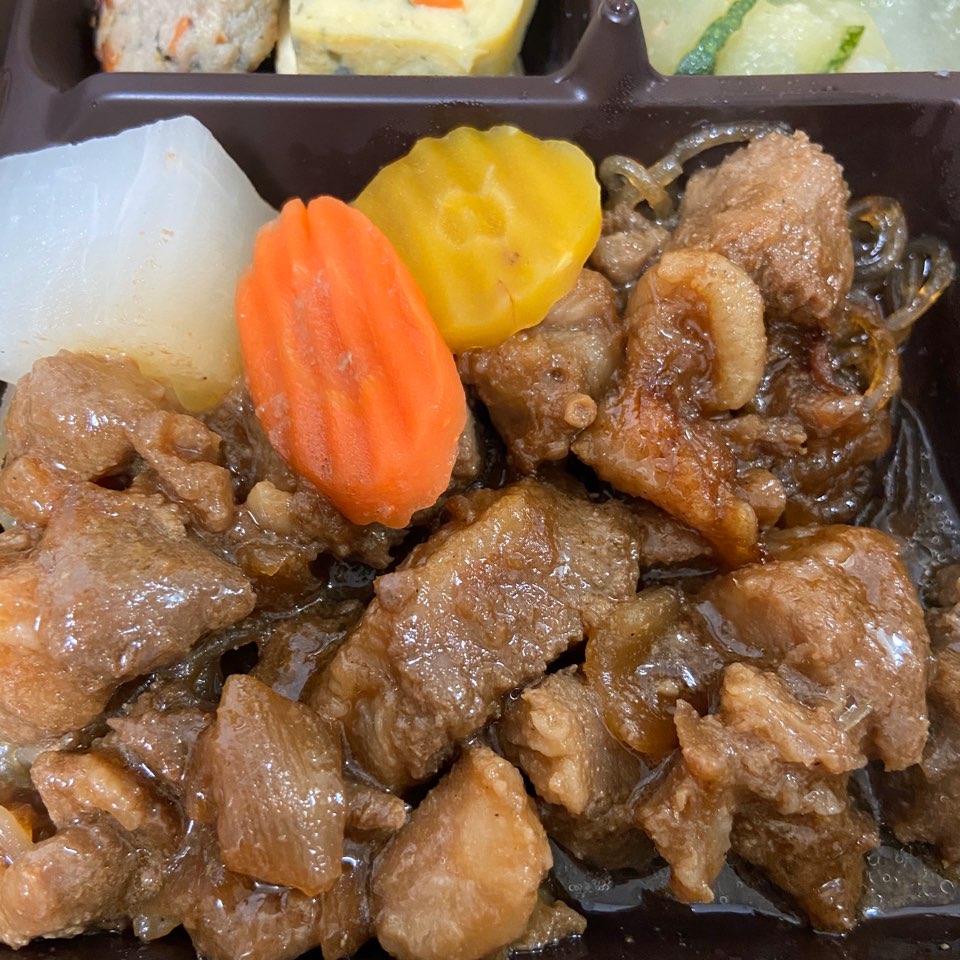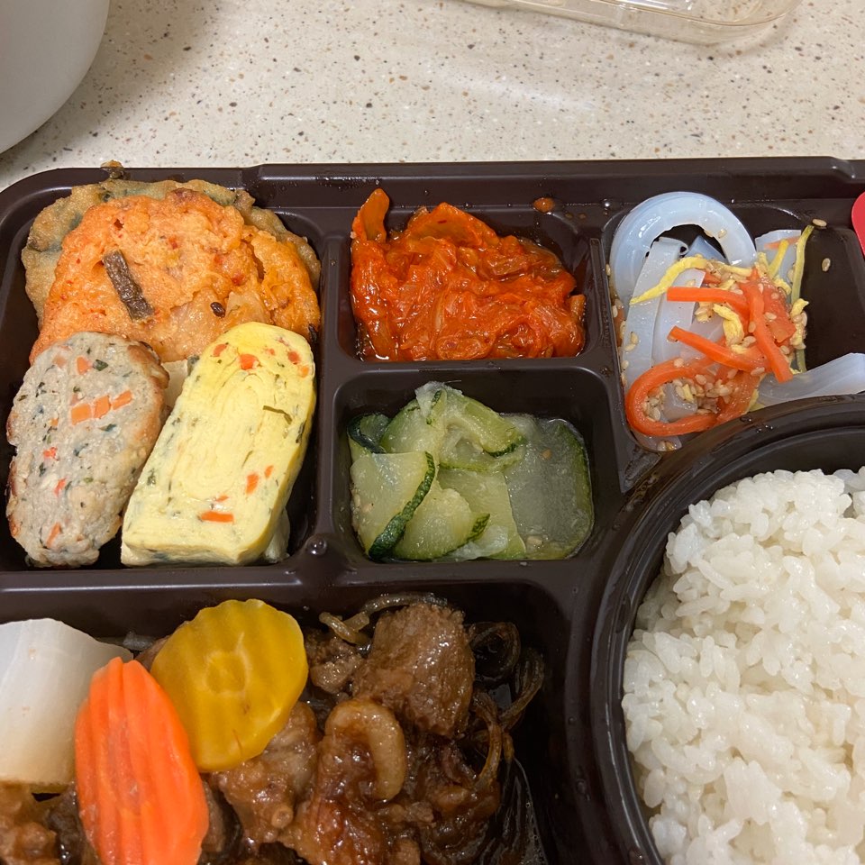 먼저 돼지갈비찜이 눈에 들어오더라구요. 밥만큼 많이 들어있습니다. 달짝지근한 향이 가득한 게 맛있을 것 같더라고요. 그리고 당근과 무까지 데코까지 이쁘게 담겨있습니다. 고기는 간이 적당한 게 밥과 먹기에 적당하였고요. 돼지갈비의 퀄리티도 편의점 도시락 치고는 나쁘지 않아 맛있더라고요. 고기 밑에는 당면도 있으니 꼭 데워서 드세요. 안 그럼 당면이 퍼석할 거 같아요.