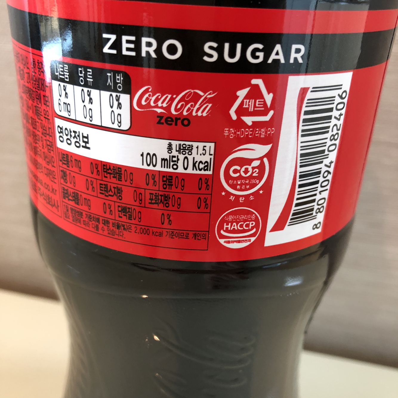 언제어디서나 즐겨먹을 수 있는 음료 중에 하나가 콜라이죠. 피자에도, 햄버거에도, 치킨에도 빠지지 않는 시원한 음료입니다. 코카콜라 중에서도 칼로리 걱정이 많은 분들을 위해 제로 슈거인 무설탕으로 만든 제로콜라입니다. 페트병으로 포장되어 있습니다. 용량은 1.5리터입니다. 칼로리는 표기처럼 0칼로리이고요.